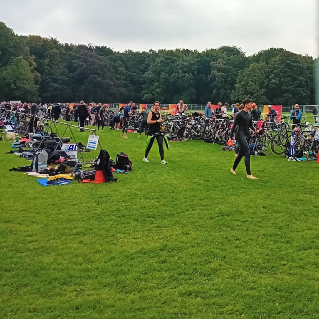 Hier zie je een foto van de DTS Triatlon in het Amsterdamse Bos — een mooi voorbeeld van hoe ik graag mijn grenzen verleg en plezier combineer met prestatie.